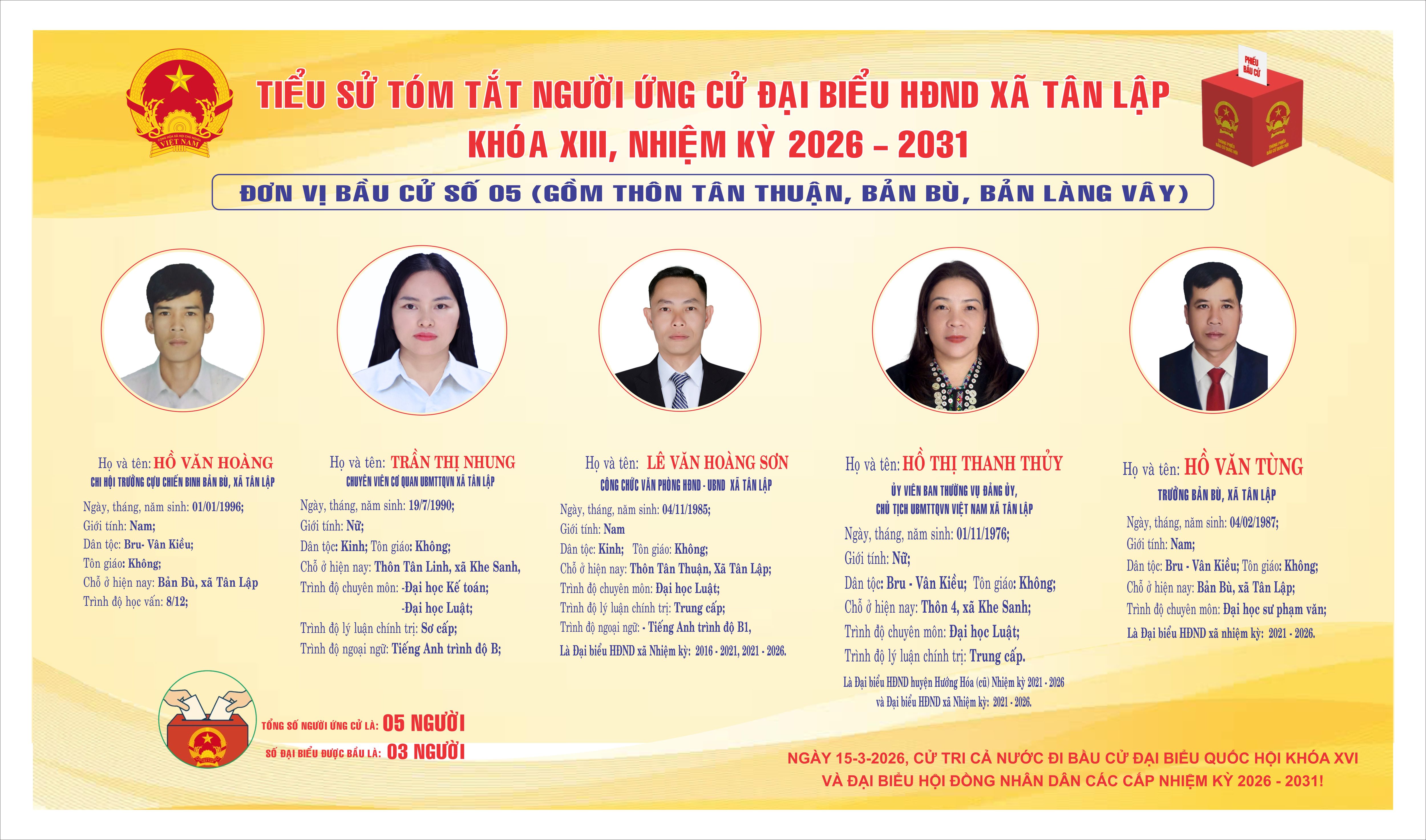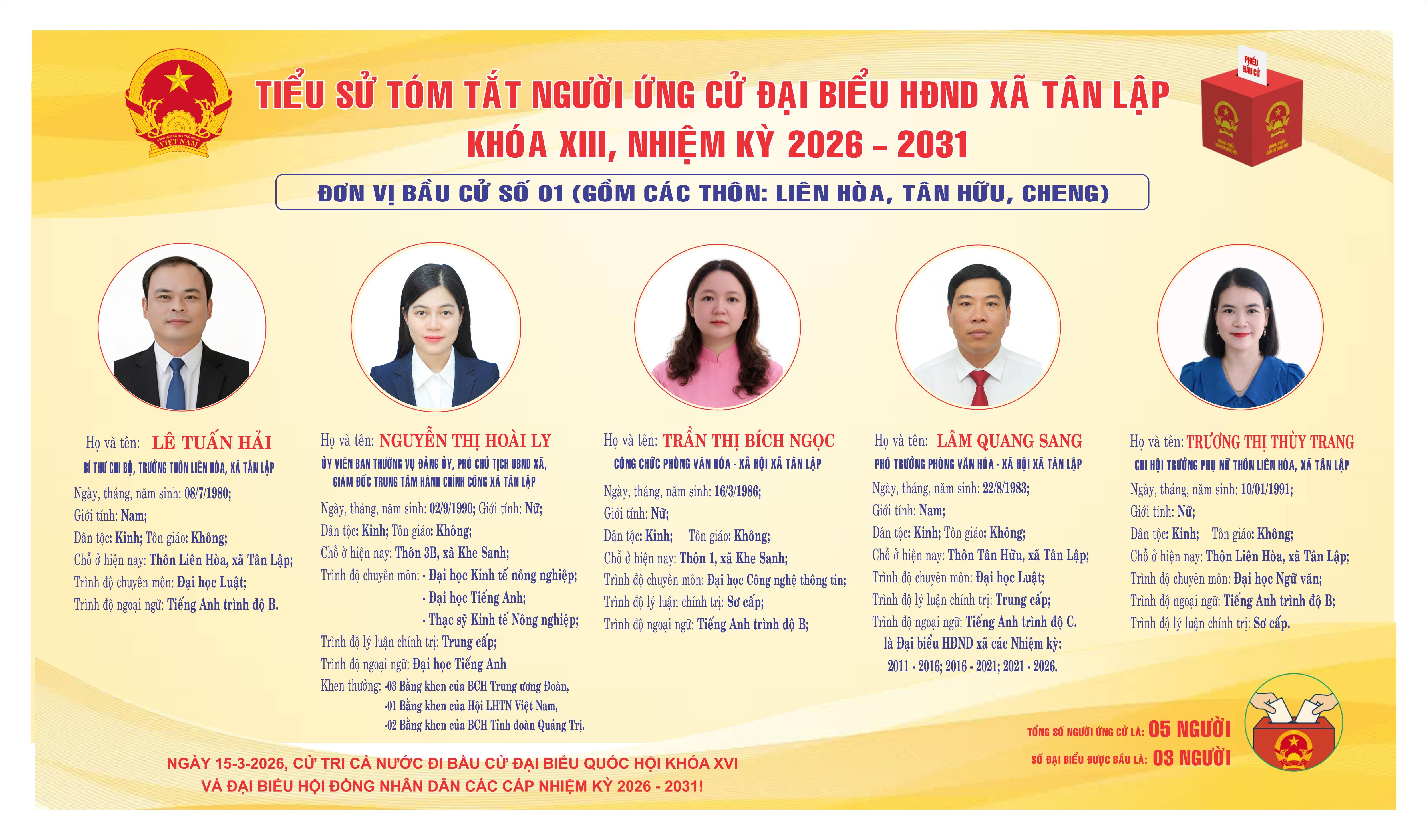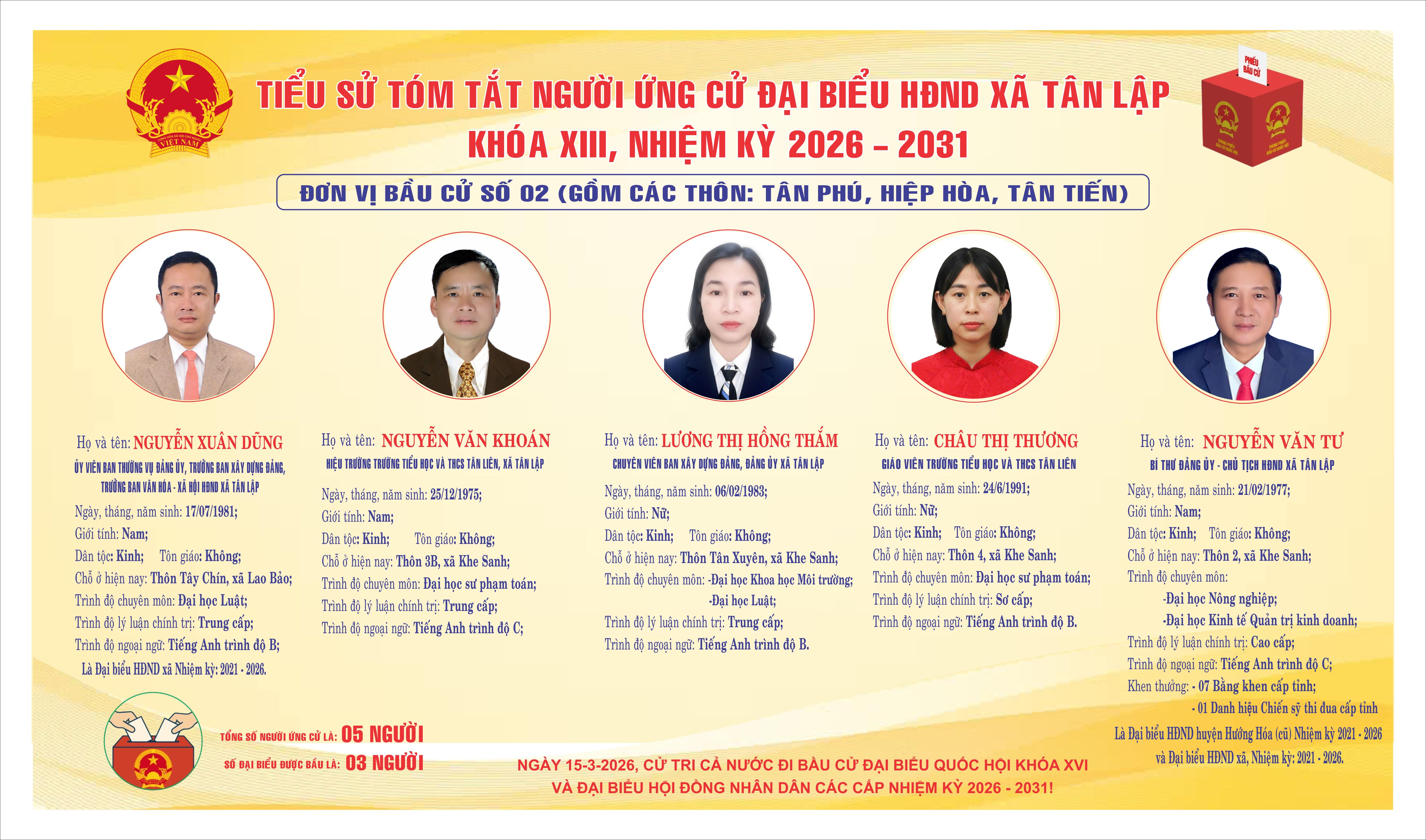 CÔNG BỐ TIỂU SỬ TÓM TẮT NGƯỜI ỨNG CỬ ĐẠI BIỂU HĐND XÃ KHOÁ XIII NHIỆM KỲ 2026–2031 TẠI 07 ĐƠN VỊ BẦU CỬ