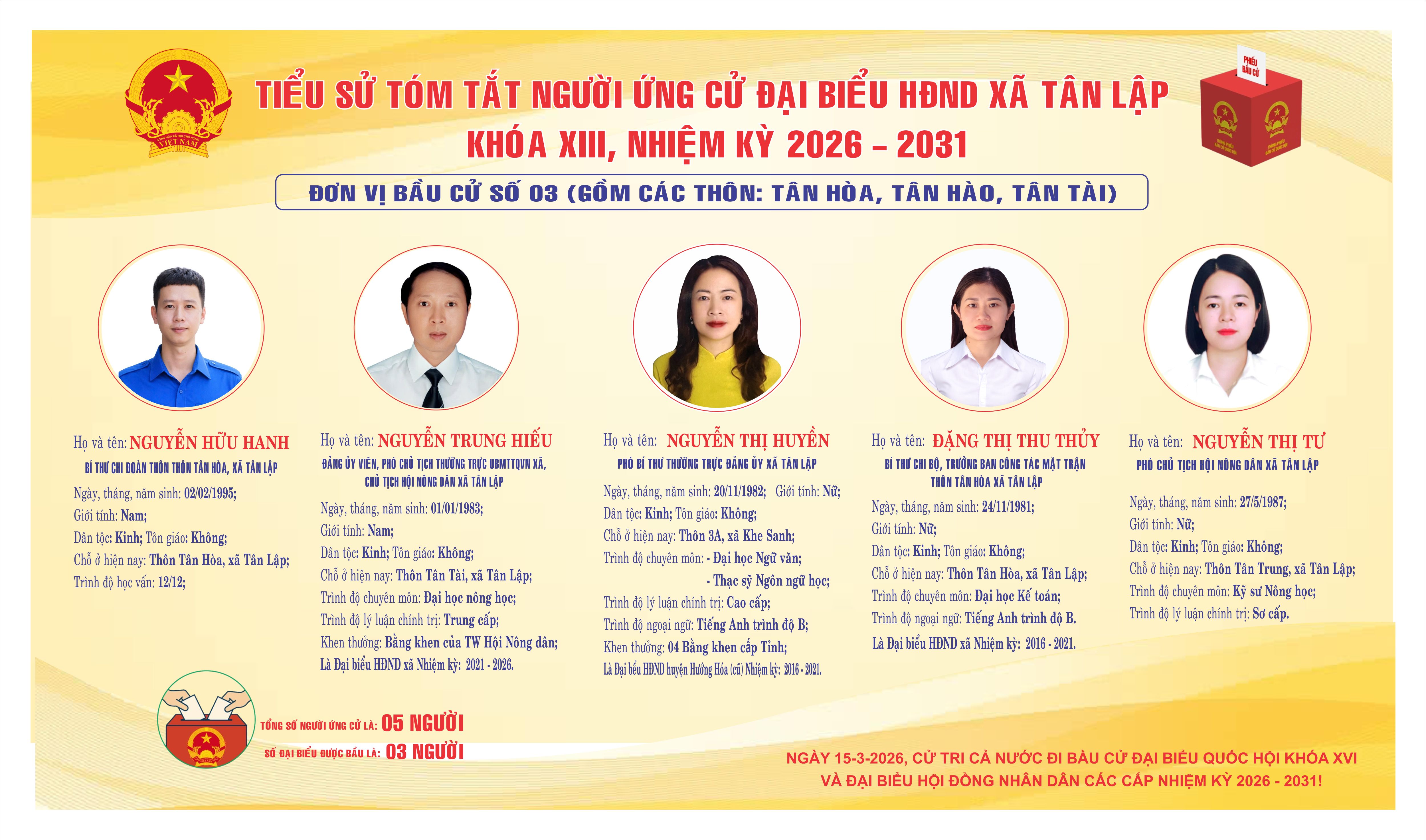 Thực hiện Luật Bầu cử đại biểu Quốc hội và đại biểu Hội đồng nhân dân; căn cứ các văn bản chỉ đạo của cấp trên về công tác chuẩn bị bầu cử đại biểu Quốc hội khóa XVI và đại biểu Hội đồng nhân dân các cấp nhiệm kỳ 2026–2031, Ủy ban bầu cử xã Tân Lập đã hoàn thành việc công bố, niêm yết tiểu sử tóm tắt người ứng cử đại biểu Hội đồng nhân dân xã Tân Lập khoá XIII nhiệm kỳ 2026–2031 tại 07 đơn vị bầu cử trên địa bàn như sau: