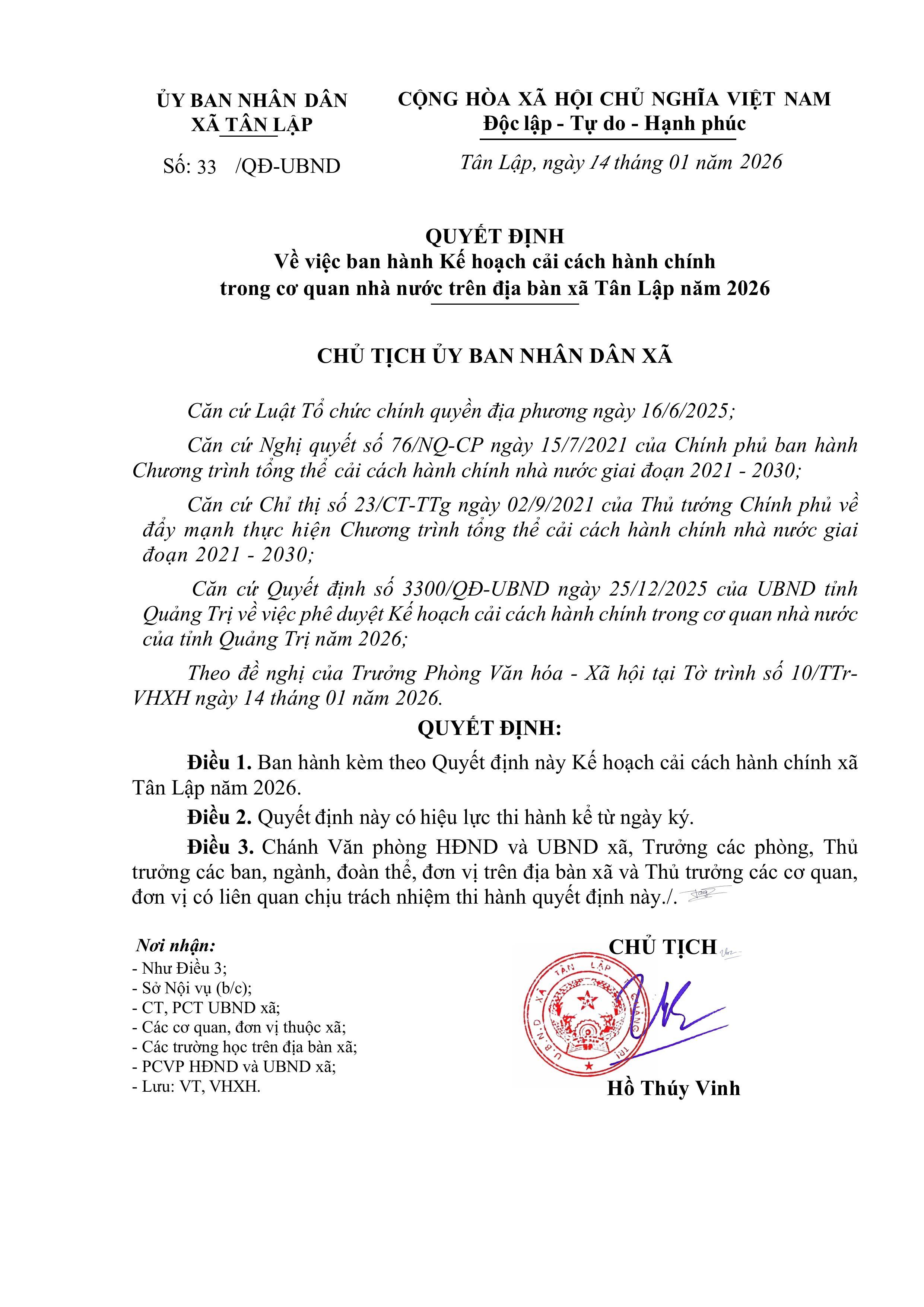 Quyết định của UBND xã về việc ban hành Kế hoạch cải cách hành chính trong cơ quan nhà nước trên địa bàn xã Tân Lập năm 2026