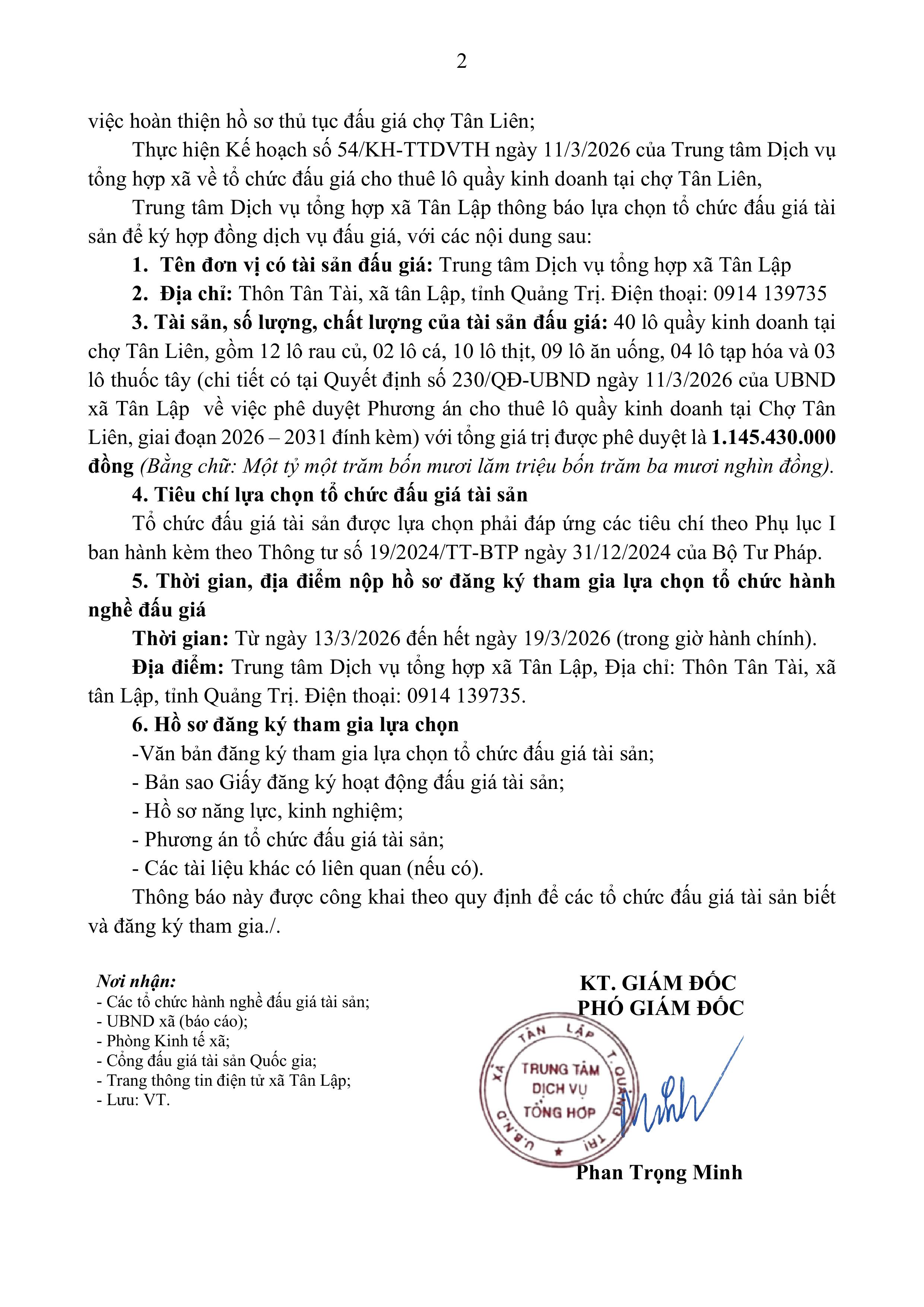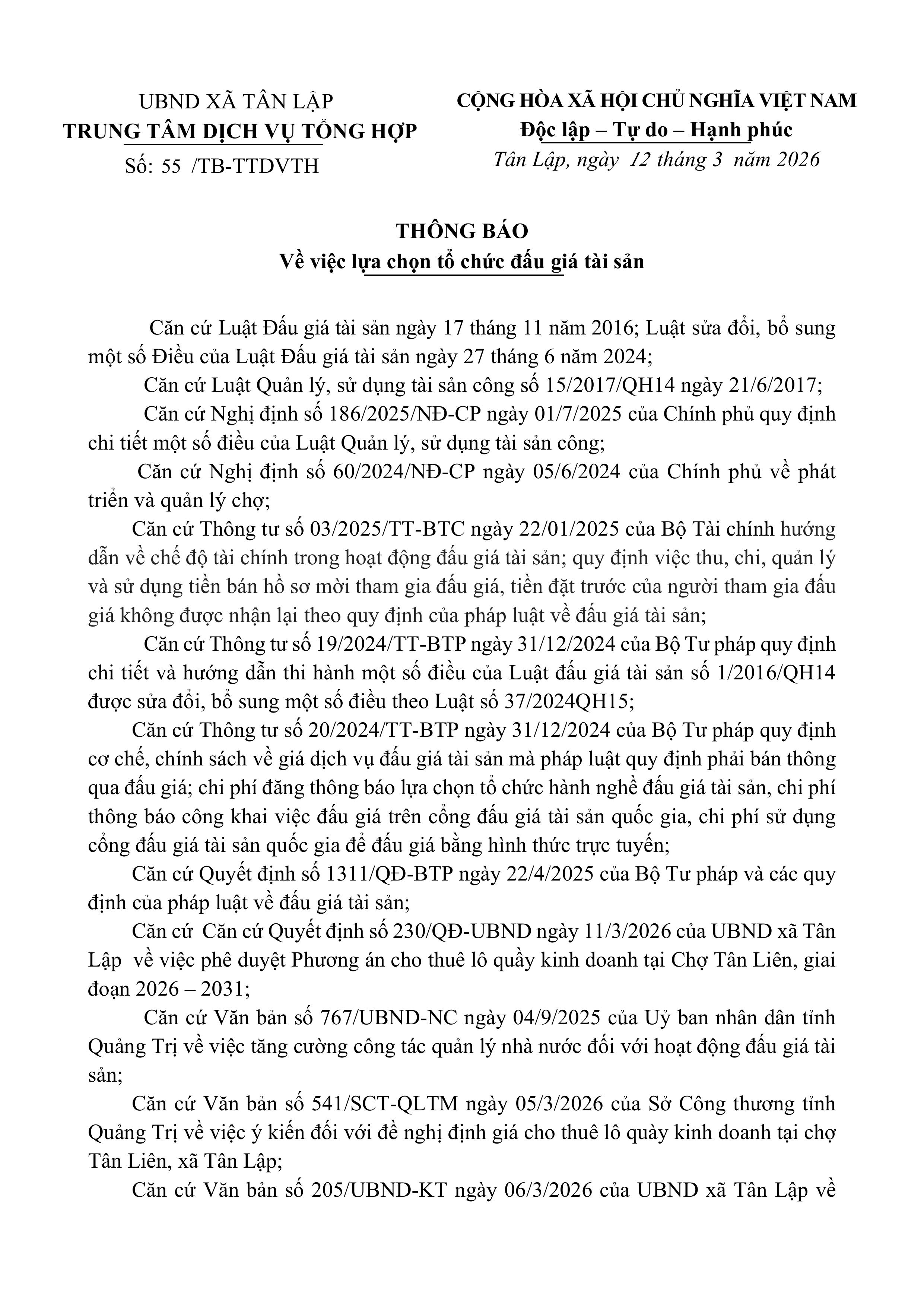 Trung tâm Dịch vụ Tổng hợp xã Tân Lập thông báo lựa chọn tổ chức đấu giá tài sản để thực hiện đấu giá 40 lô quầy kinh doanh tại Chợ Tân Liên (giai đoạn 2026 – 2031).
