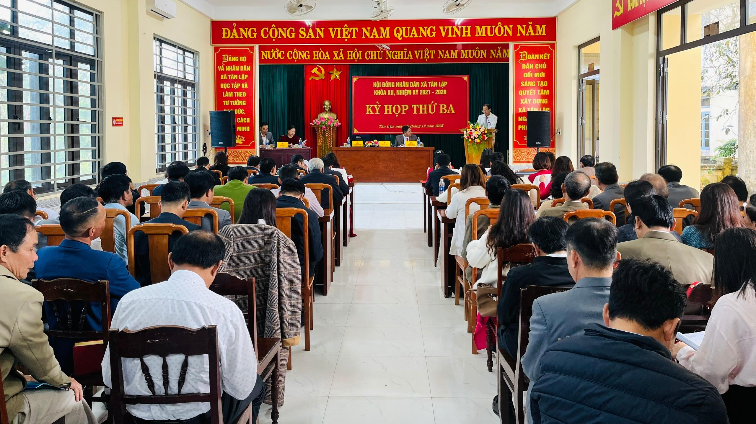 Ngày 30/12/2025, Hội đồng nhân dân xã Tân Lập đã tổ chức Kỳ họp thứ ba HĐND xã khóa XII, nhiệm kỳ 2021 – 2026 nhằm đánh giá kết quả thực hiện nhiệm vụ năm 2025 và quyết định những vấn đề quan trọng của địa phương trong năm 2026. Kỳ họp do đồng chí Nguyễn Văn Tư – Bí thư Đảng ủy, Chủ tịch HĐND xã và đồng chí Hồ Thao Bôn Minh – UV BTV, Phó Chủ tịch HĐND xã chủ trì.