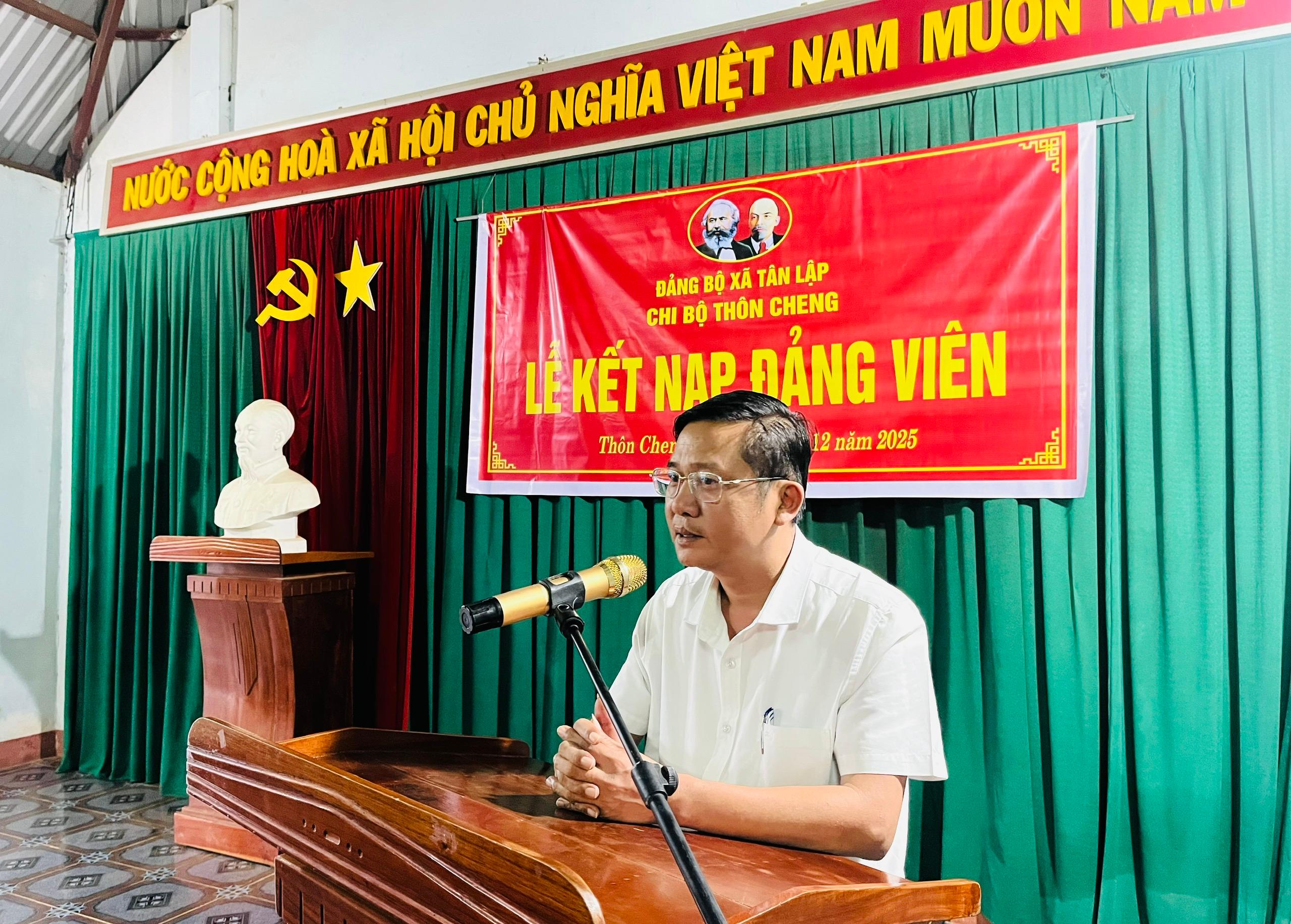 Phát biểu chỉ đạo tại buổi lễ, đồng chí Nguyễn Văn Tư, Bí thư Đảng ủy, Chủ tịch HĐND xã chúc mừng Chi bộ thôn Cheng đã kết nạp được 01 đảng viên mới; đồng thời ghi nhận và biểu dương những nỗ lực của Chi bộ trong công tác phát hiện, bồi dưỡng, tạo nguồn phát triển đảng viên thời gian qua. Đồng chí đề nghị các đảng viên mới tiếp tục phát huy tinh thần tiên phong, gương mẫu, tích cực học tập và tham gia hiệu quả các phong trào ở địa phương, góp phần xây dựng Chi bộ thôn Cheng ngày càng trong sạch, vững mạnh.
